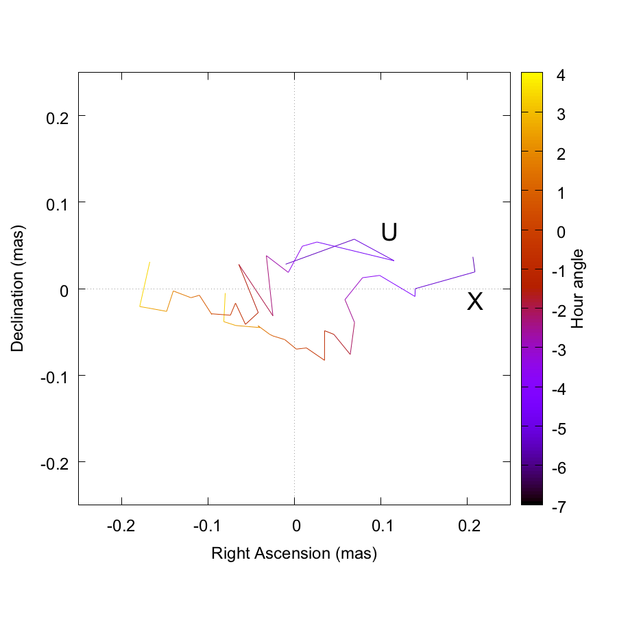 Hi,I've been reducing some archival VLBA data from 2000 of a gravitational lens. The project code is GX006 and this was a longtrack observation that regularly swapped between standard continuum setups at 8.4 and 15 GHz. Despite the 'G' in the code, this is VLBA only. One image (A) is very bright (~400 mJy) and is a AGN core with a short jet. The other image (B) is ~12 times fainter and 1.6" away. I perform standard data reduction in AIPS with fringe fitting peformed initially using a point-source model at the phase centre. I then map and self-cal using IMAGR/CALIB.The resulting map of A looks pretty good, but that of B looks much worse. The noise is higher, there are significant residuals around the source. As a test, I subtracted the clean components of A using UVSUB and phase calibrated the data using a map of B alone. The phase solutions showed essentially a linear slope with time and a subsequent map of B looked fantastic. As a further test, I wrote the UVSUB'd data to disk and fitted a point source to B in difmap. This shows (see attachment) that B drifts during the observation, predominantly in RA and this will be what the B-only phase self-cal is correcting for. The drift is pretty big and I doubt very much that it has an astrophysical origin. I see the same effect at X and U Bands.I'm hoping that someone can help me understand the origin of this problem and perhaps correct for it. The only thing that I've come up with so far is whether this could be anything to do with the earth orientation parameters. I was looking at the VLBA memo relating to the large errors found in 2005 and I was interested to see that the effect of these is to move a source in RA i.e. similar to what I see. Now, these data were not observed during a time in which the EOPs were known to be greatly in error and neither am I phase referencing, but this is the only possibility I've been able to think of so far. If there are errors in the EOPs, and generally speaking there is always some level of error, these will be taken out through self-calibration for A, but might it be that B cannot be properly corrected because it's not at the phase centre?Alternatively, the separation between the two lensed images lies along PA=144 deg i.e. approximately north-south. Therefore, the shift in B could almost be viewed as a small rotation.Thanks in advance for your help.Andy