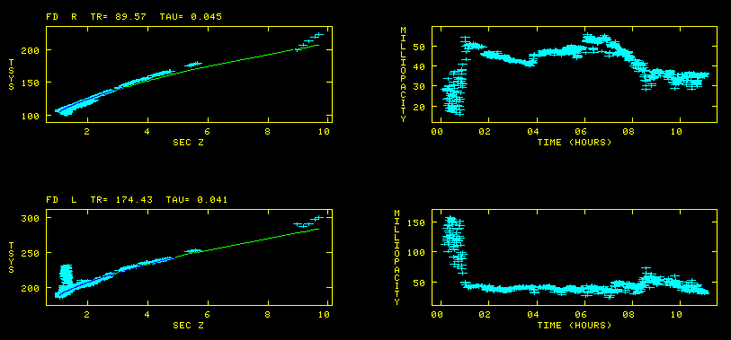 Even if I am currently looking at 86 GHz data, I sometimes saw some offsets between different IFs in Tsys vs secz plots for other lower frequency data (though not as severe as the current one). If you look at the attached AIPS_APCAL.png, we cannot see the offsets between different IFs for LCP. The fitting result is somewhat strange with the obtained opacity being all negatives. I also tried to run APCAL for each IF. Please have a look at the attached APCAL_IF2.png and APCAL_IF7.png. It seems that the fitting works well for some IFs showing relatively low Tsys values, while it doesn't for the IFs showing high Tsys values.