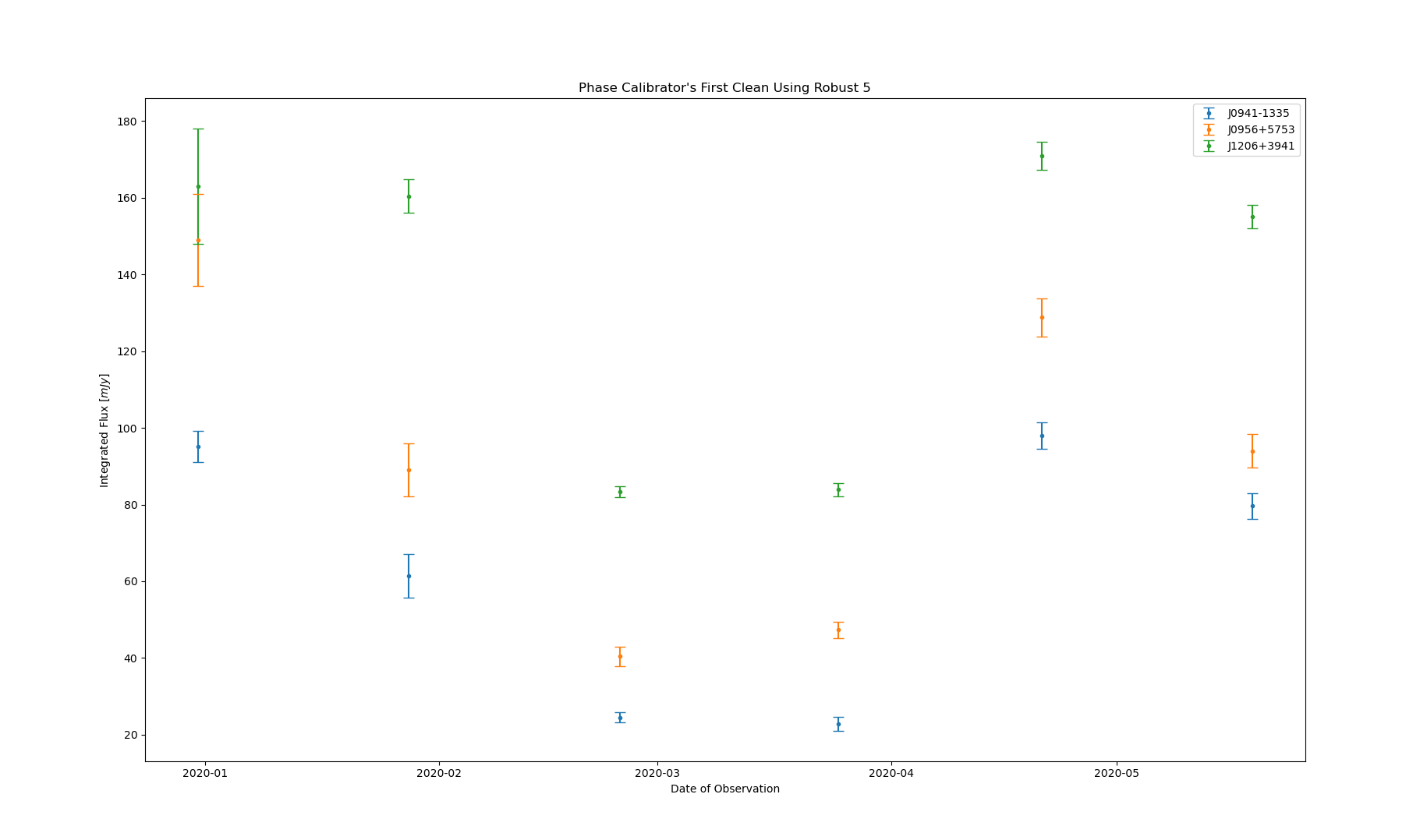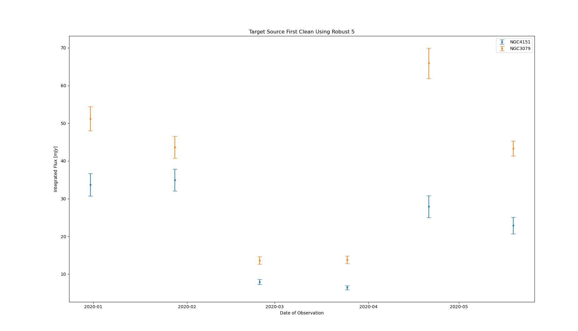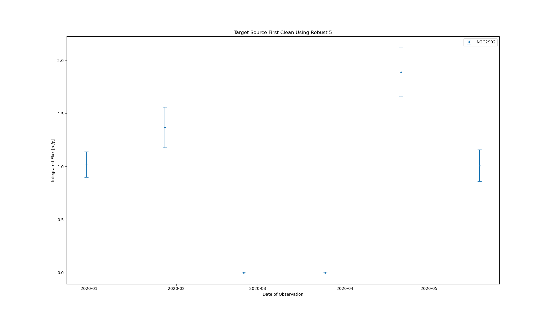 I have attached graphs showing the Integrated fluxes with uncertainties as well as a graph of the RMS values for the Phase calibrators & Target Sources. These values were obtained without any self calibration and are just from the first cleaned images. For NGC2992, since there were no detections for February and March, I left the Integrated Flux as 0.