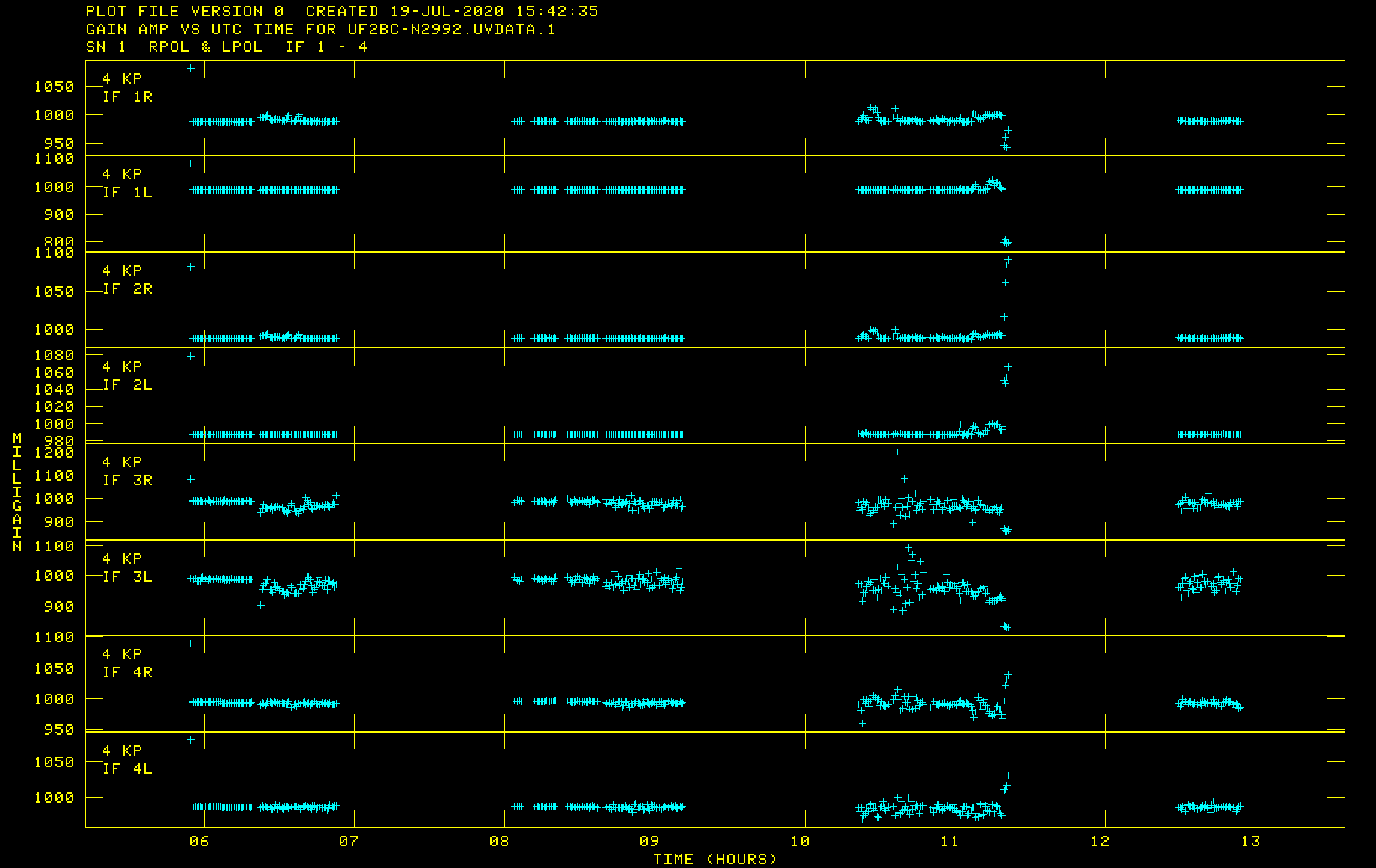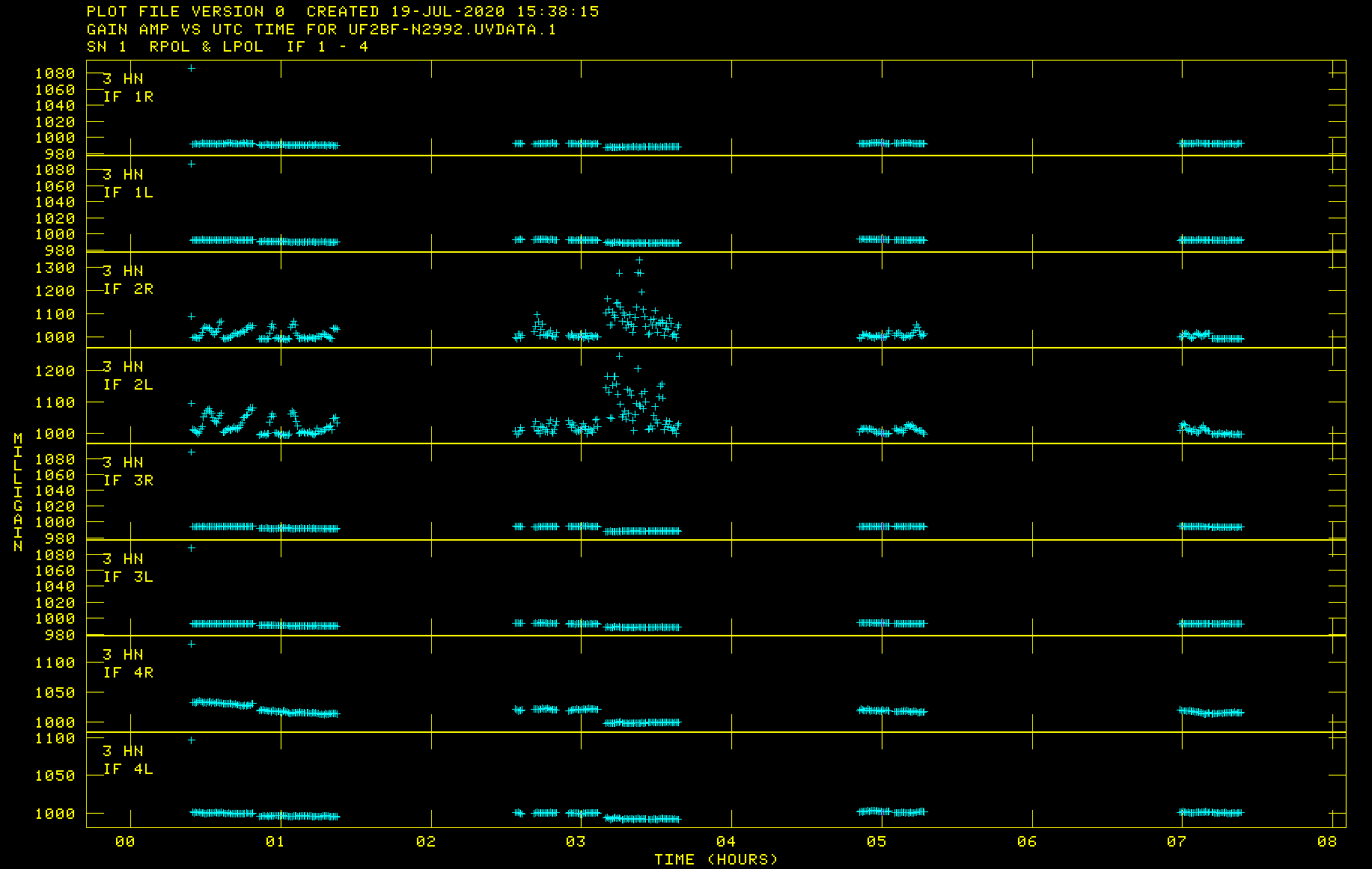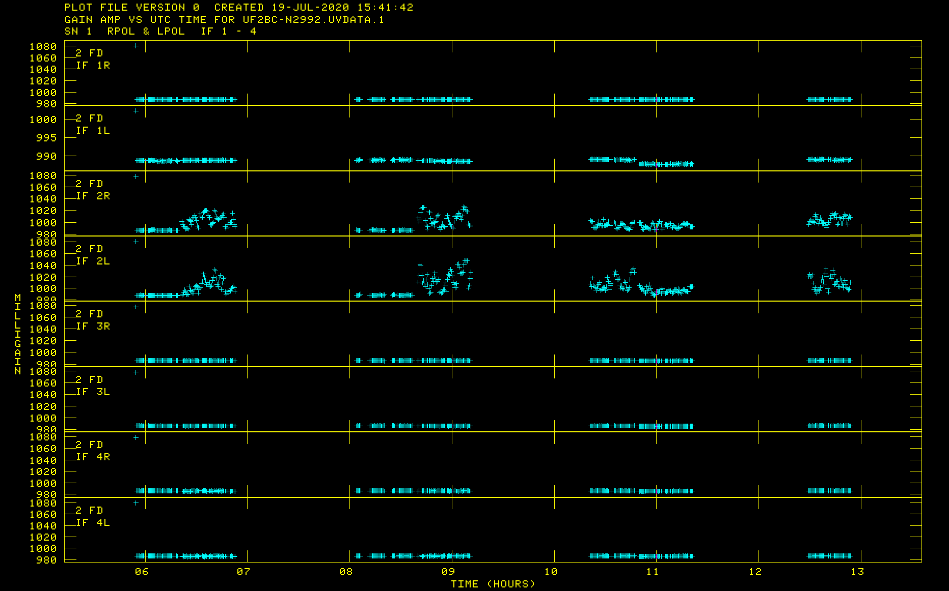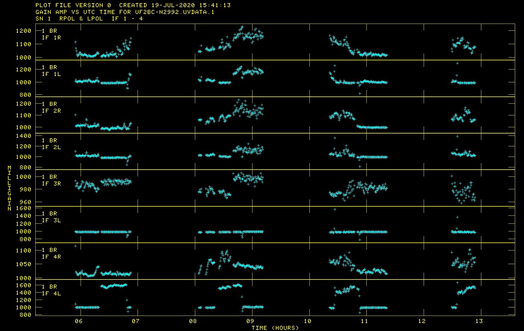 I also tried to rework fresh data from UF002BC by flagging out any bad data points using the task SNEDT for the TY table, Flagging any data under an elevation of 10 degrees as well as IF 4 (since this has an issue with phase) using the task UVFLG, and flagging out any frequencies that have RFI at different baselines before performing any calibrations using the task WIPER. There is an increase in the Integrated flux, but not significantly. For NGC 3079, this increased the Integrated Flux from originally 13.6 mJy to 14.4 mJy, but the uncertainty is 1 mJy for both. The Peak also increases from 3.01 +/- 0.18 mJy/beam to 3.78 +/- 0.22 mJy/beam. As for its phase calibrator J0956+5753, the Integrated Flux increases from 40.4 +/- 3 mJy to 42.2 +/- 1.9 mJy with a Peak increase from 26.6 +/- 1.2 mJy/beam to 31.0 =/- 0.91 mJy/beam. Which are both close to each other and not much of an increase, although the phases look much better than before and the RMS values did improve as well. It is still not accounting for the large difference in amplitude compared to the other data sets.