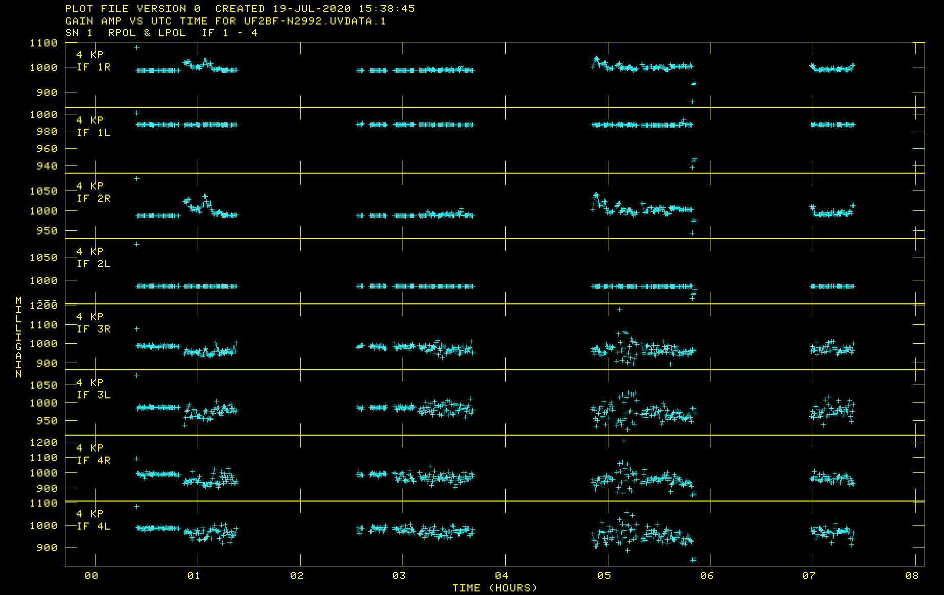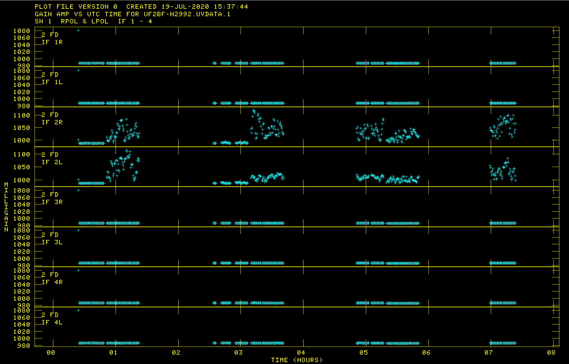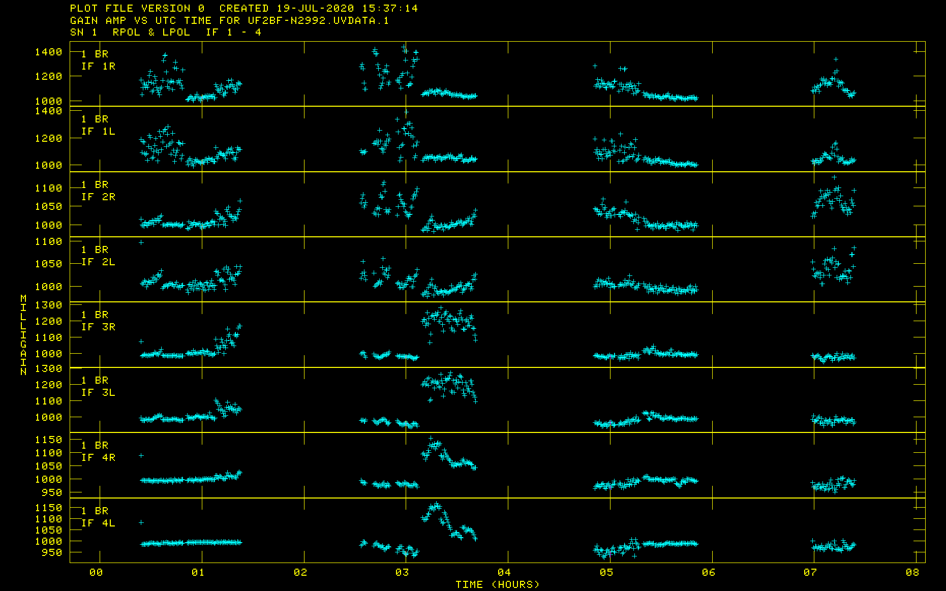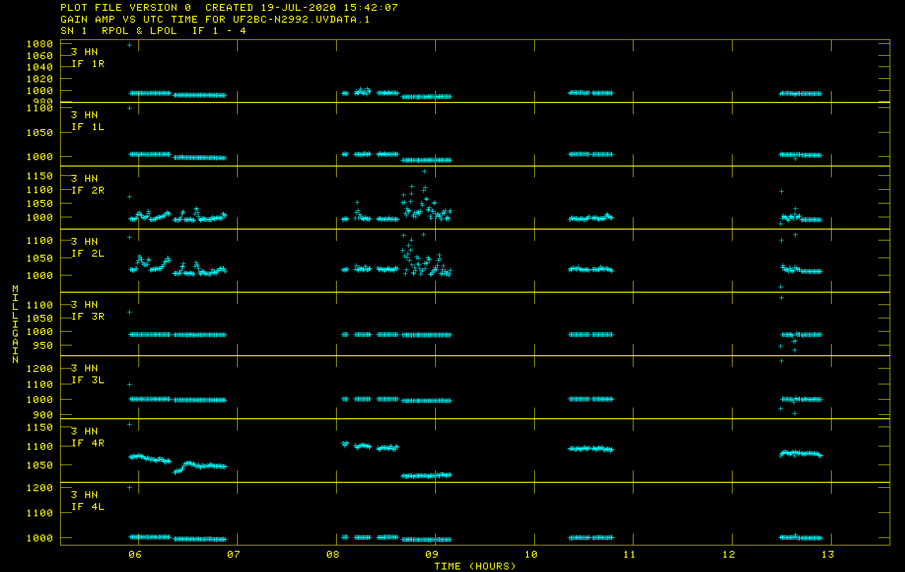 I also tried to rework fresh data from UF002BC by flagging out any bad data points using the task SNEDT for the TY table, Flagging any data under an elevation of 10 degrees as well as IF 4 (since this has an issue with phase) using the task UVFLG, and flagging out any frequencies that have RFI at different baselines before performing any calibrations using the task WIPER. There is an increase in the Integrated flux, but not significantly. For NGC 3079, this increased the Integrated Flux from originally 13.6 mJy to 14.4 mJy, but the uncertainty is 1 mJy for both. The Peak also increases from 3.01 +/- 0.18 mJy/beam to 3.78 +/- 0.22 mJy/beam. As for its phase calibrator J0956+5753, the Integrated Flux increases from 40.4 +/- 3 mJy to 42.2 +/- 1.9 mJy with a Peak increase from 26.6 +/- 1.2 mJy/beam to 31.0 =/- 0.91 mJy/beam. Which are both close to each other and not much of an increase, although the phases look much better than before and the RMS values did improve as well. It is still not accounting for the large difference in amplitude compared to the other data sets.