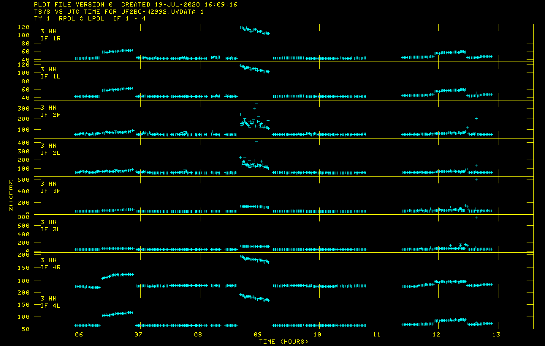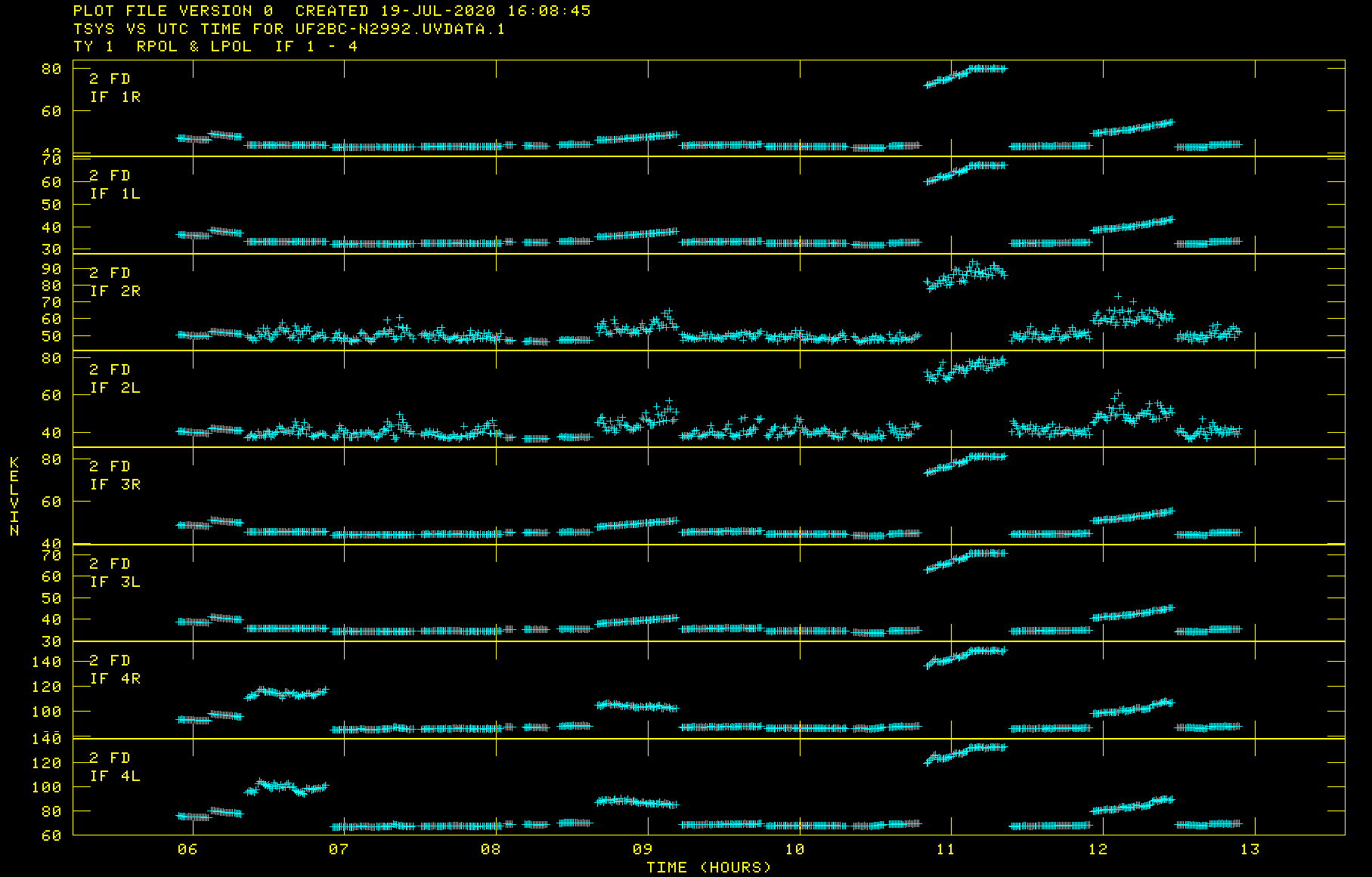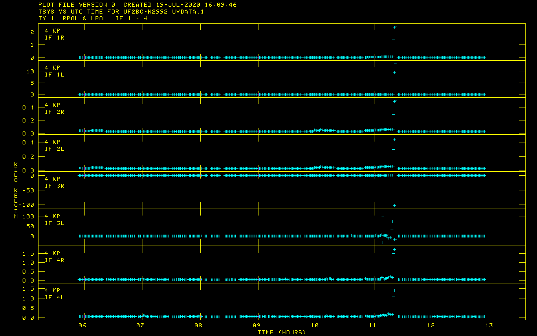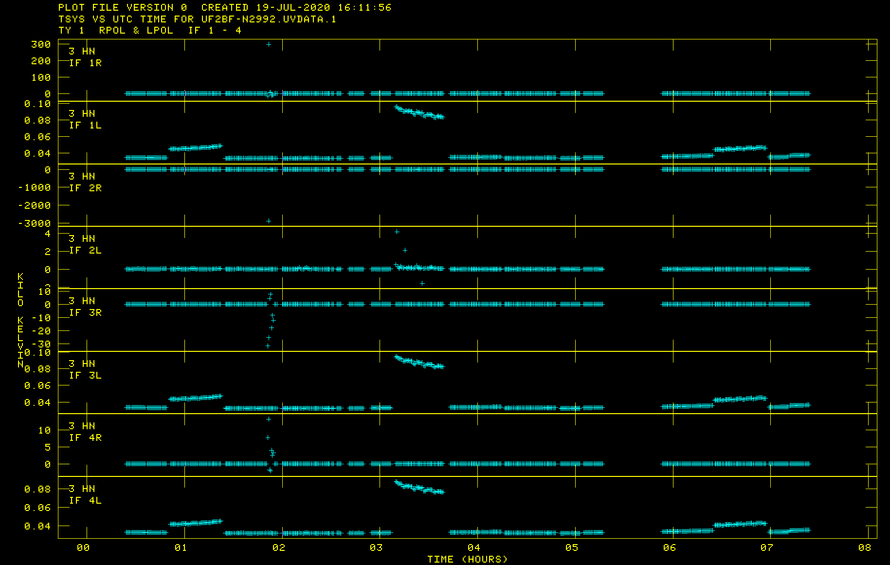 I took screen shots comparing two different datasets UF002BC (One of the problem data sets) and UF002BF (One of the best data sets) for both the SN table after running the task VLBACCOR as well as the TY table. I have attached them and only included 4 out of the 10 antennas for reference. They do seem to have similarities.