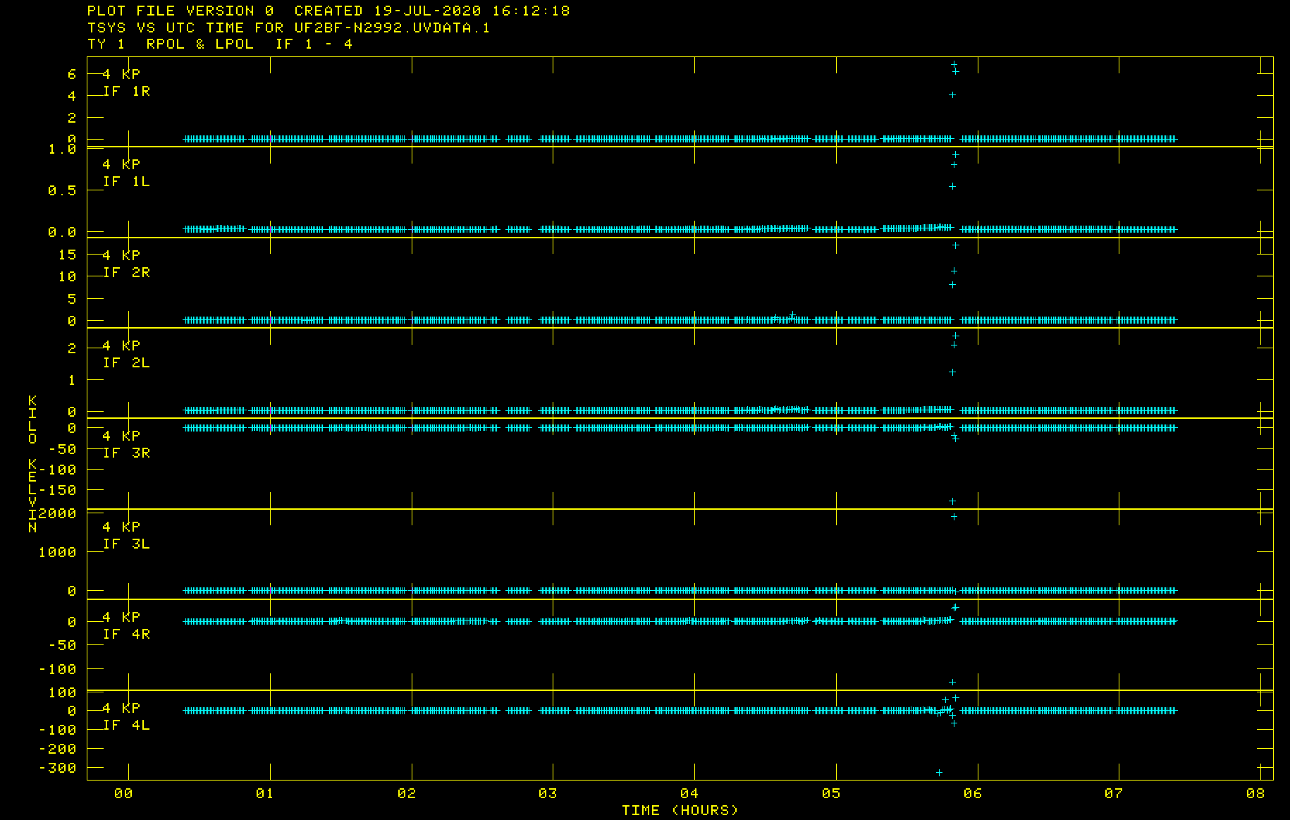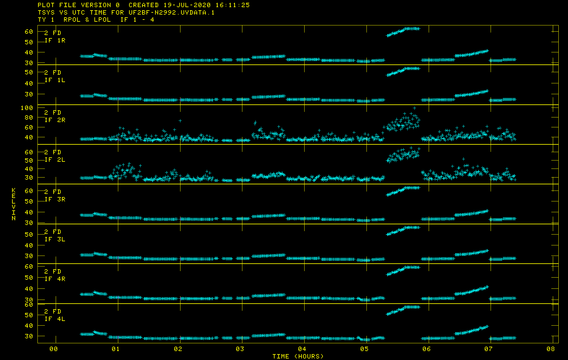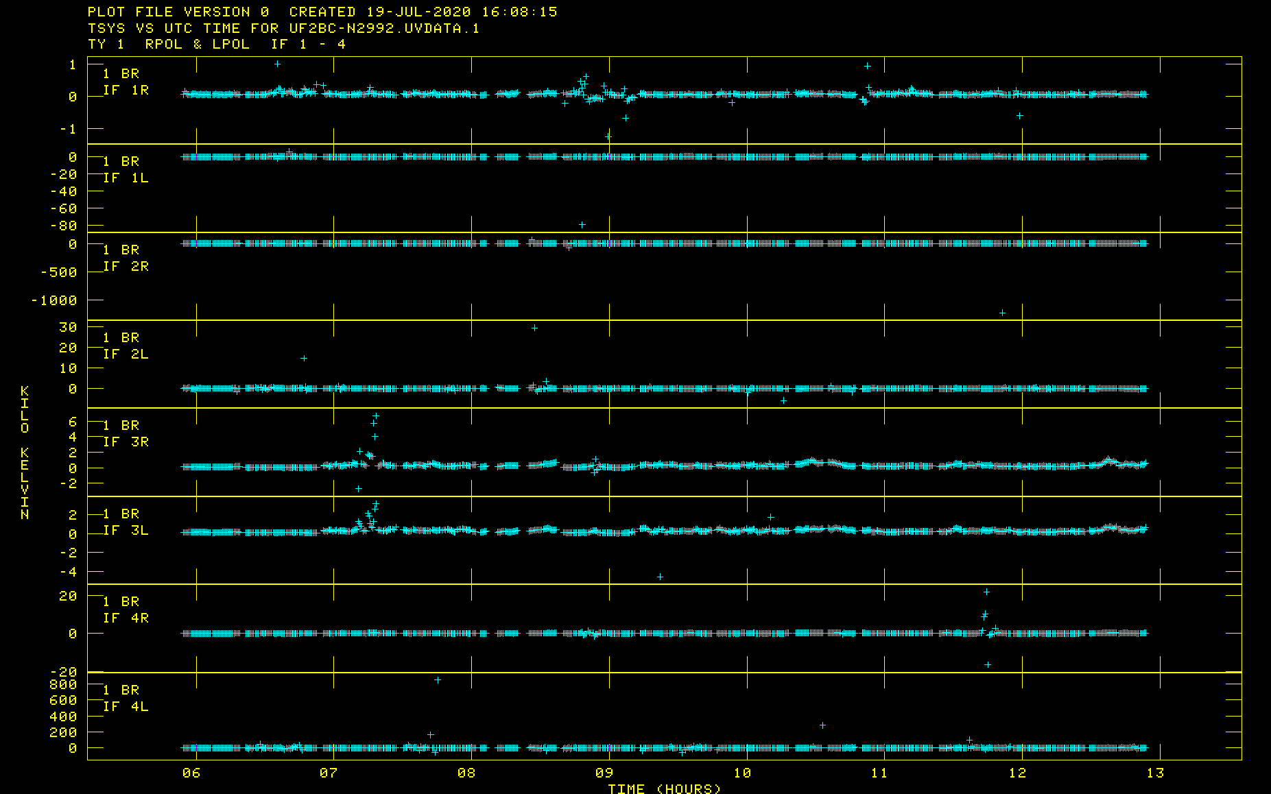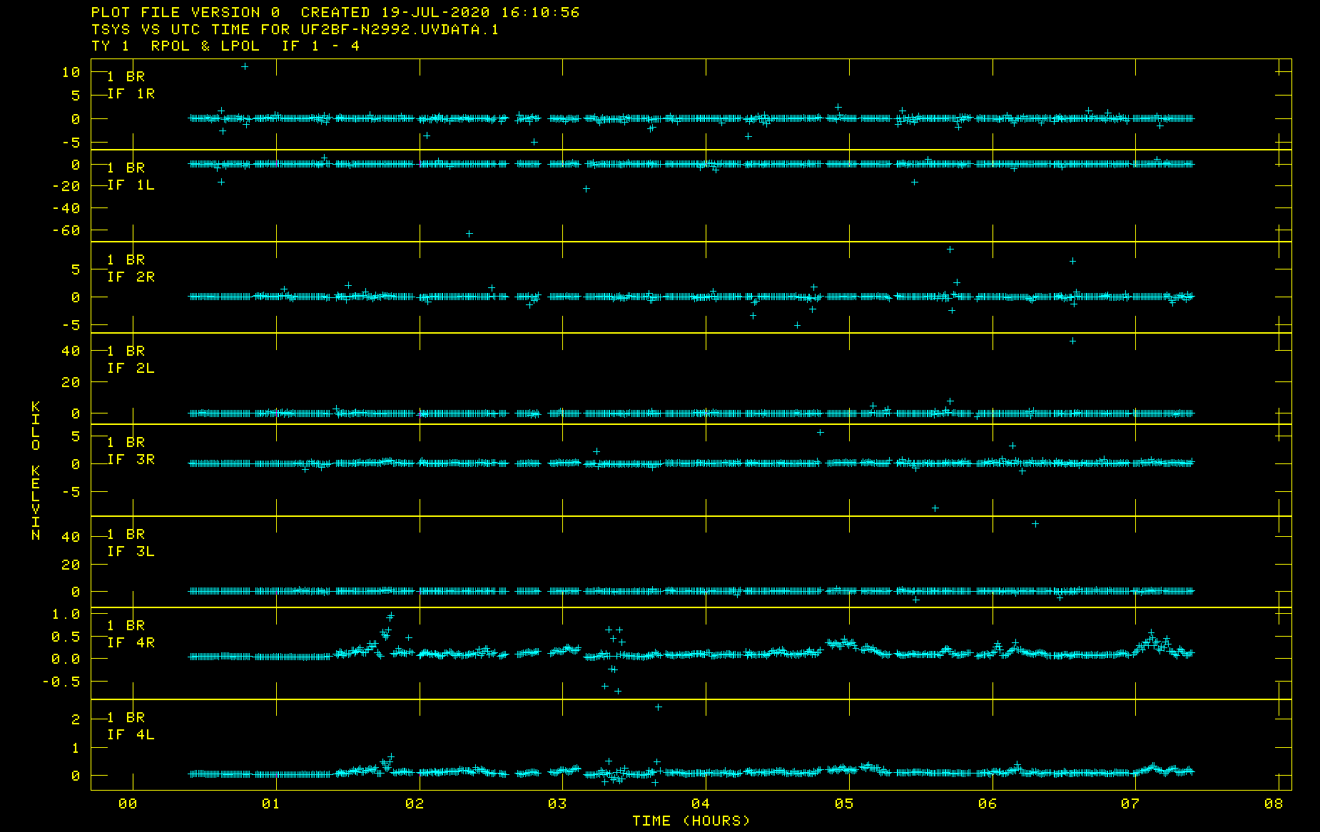 I took screen shots comparing two different datasets UF002BC (One of the problem data sets) and UF002BF (One of the best data sets) for both the SN table after running the task VLBACCOR as well as the TY table. I have attached them and only included 4 out of the 10 antennas for reference. They do seem to have similarities.