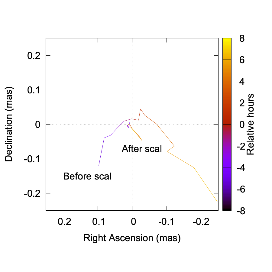 Here is a similar plot to that which I posted before - it shows the position of B (which is nearly a point source) as a function of time. This is in the full self-calibrated dataset (A+B) before I subtract the clean components corresponding to the brighter image (A). The variation is pretty symmetrical which is what worries me. The smaller locus of points is the position of B (using modelfit in difmap) in the B-only dataset after it has been self-cal'd. B now wanders much less and the line points towards the weak jet in this image so I think this is pulling the fit in some systematic way. Anyway, it can be seen what the self-cal is having to overcome to make a decent image in B.