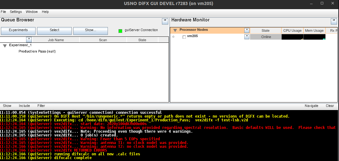 I am also able to run the guiServer, gui client, calcServer, mk5daemon (without actually having the mk5 hardware). On the gui client, I have the processor node shows up in the hardware monitor. Now I am trying to run "Experiments" from the GUI with the same synthetic test-lsb.vex file and generated vdif data. But when I execute the experiment, I ran into error on when running "calcif2" or "difxcalc" so the experiment stuck on waiting for the ".im" file. Also I am not sure where I can input the generated vdif data during the experiment. Appreciate any pointer or guidance. My goal is to see how an Experiment is run from start to finish. Thank you.